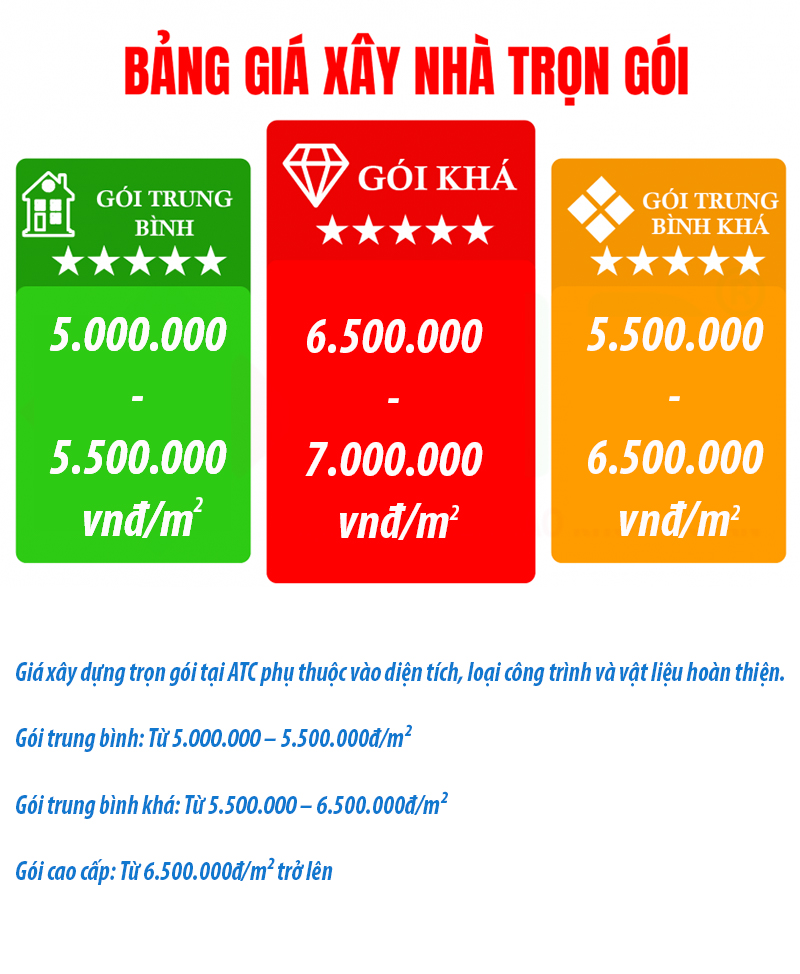 Giá xây dựng trọn gói tại ATC phụ thuộc vào diện tích, loại công trình và vật liệu hoàn thiện.
