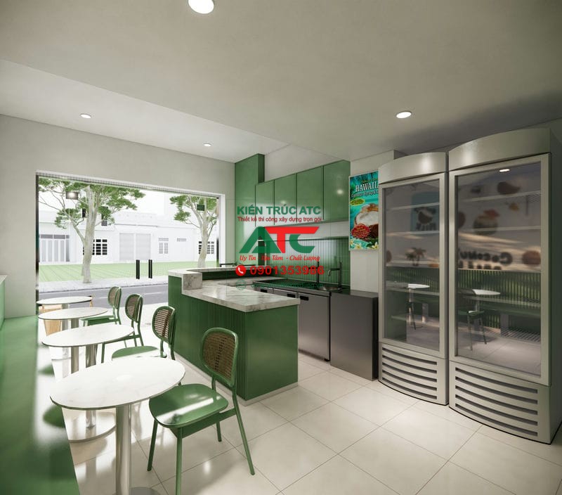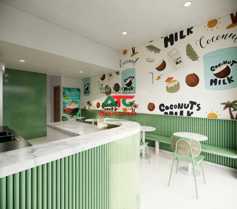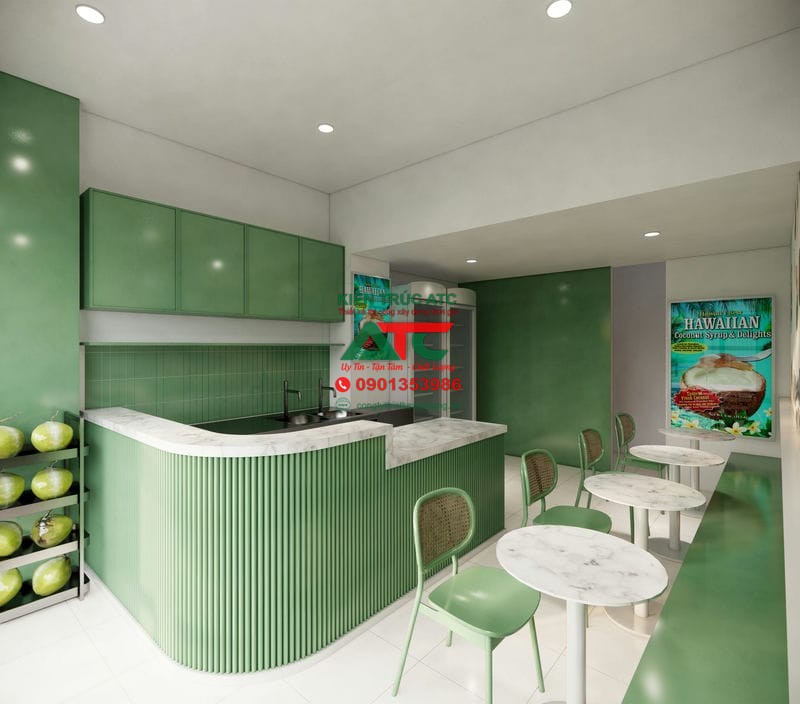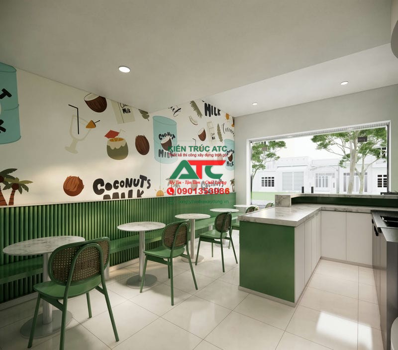 Tối ưu không gian: Thiết kế hợp lý để tối ưu công năng, bao gồm khu vực order, khu vực pha chế và khu vực khách ngồi, đồng thời đảm bảo sự thoải mái.